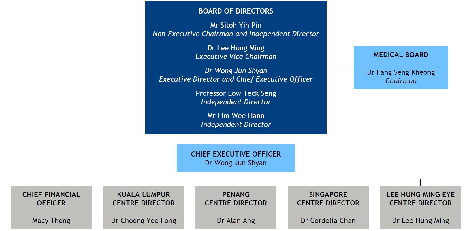 Dr Wong Jun Shyan is our Chief Executive Officer and is an ex-officio member of our Medical Board. Dr Wong was one of the founding members of ISEC KL and has been a Consultant Ophthalmologist at ISEC KL since 2007. He is considered a key opinion leader in his fields of subspecialty and Honorary Part Time Lecturer for the Department of Optometry, Faculty of Allied Health Sciences in Universiti Kebangsaan Malaysia.